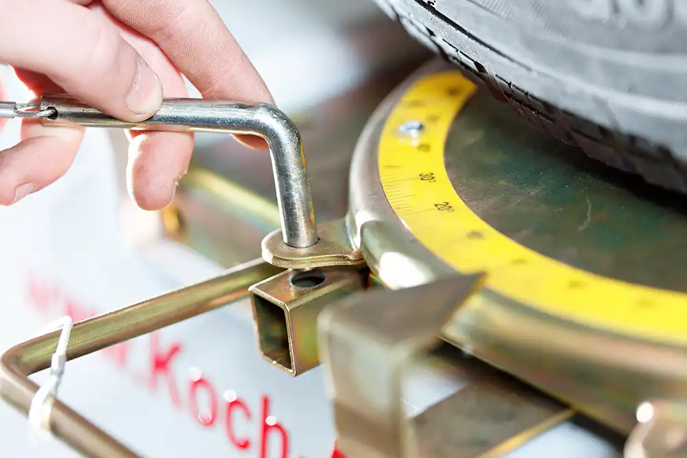 Wir führen eine Achsvermessung durch und justieren Spur und Winkel für ein sicheres Fahrverhalten.